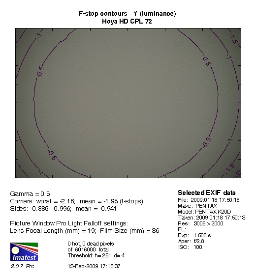 Final result: 27.52/37.5 points. In our overall ranking the Hoya HD would be the sixth, right behind a Sigma and a Kenko. The 1/10000-1/1000 extinction coefficient is a decent result. Its value for the red colour makes us feel unsatisfied, though. The reason of such a performance is the extinct polarization transmission, which increases from as soon as about 730 nm. The polarizer becomes translucent for shorter wavelengths than its competitors. The mean transmission exceeded 40% what is a very good result. The C1 and C2 graphs indicate that we’re dealing with a zero-order quarter-wave plate designed for the middle range of visible spectrum.We also tested a 67mm filter which results were very much alike with one exception – homogeneity.