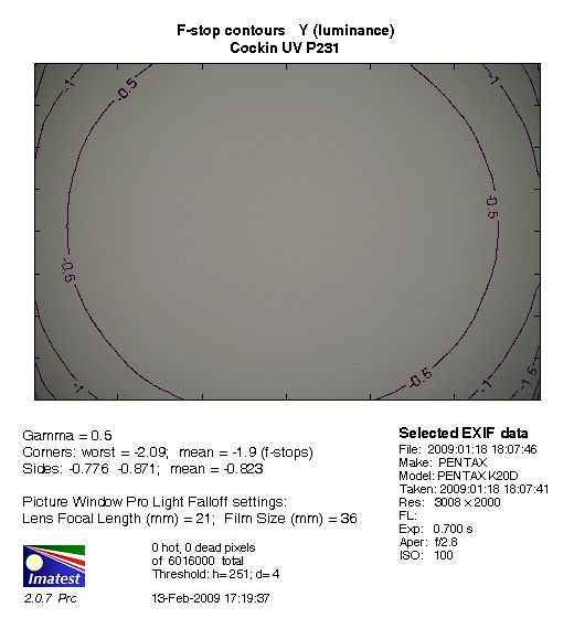 The filter score is 23/45 (51.1%).Taking into account the previous ranking and omitting the homogeneity score, which wasn’t tested before, the Cokin UV P231 would be 14th overall, right behind the Marumi 72 mm UV.
