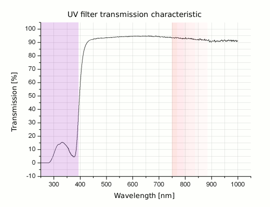 The UV absorption edge interferes a bit with the visible part of the spectrum. Near 300-350 mm you can observe a partial UV transmission. The filter has a flat transmission characteristic, it’s a pity it is not on a higher level. As you can see on the photo, the filter is slightly yellowish and this colour is responsible for absorbing the radiation from 400 nm downwards. In the pictures you can also notice significant flares. If you looked at the previous UV filters test, the Cokin UV P231 would take 4th place from the end due to the loss of points for transmission and flares. You can hardly call it a revelation.