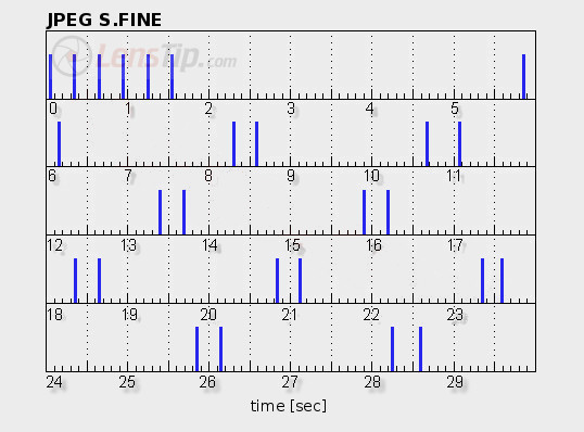 As we can see, the X1 performs quite well here. In the first second, whatever the quality we use, the camera is capable of capturing even 4 images and this speed is maintained for 6 exposures. The difference between saving JPGs alone and in combination with DNG files can be seen in the way the buffer is cleared. In the case of JPEG files the camera clears the buffer faster and captures images in pairs, in more or less 2.5 seconds interval. In the case of DNG+JPEG after capturing the first 6 images, the buffer is clearing for almost 12 seconds, after which another six-shot series is taken.