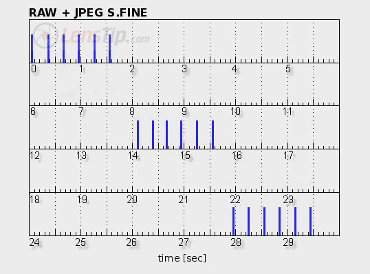 The timings of continuous shooting were measured for the High mode, using the SanDisk Extreme III 8.0 GR memory card with ISO set to 1600 and the shutter speed of 1/1000 second. For particular kinds files we’ve obtained the following results during a 30-second interval: