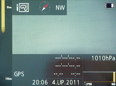 Not very accurate, you must admit. Especially when it is available only in the “beach and snorkeling” mode and doesn’t work in the “underwater photos” mode; perhaps the producer anticipated the latter mode to be used only with an underwater casing and in that casing, as you know, the pressure doesn’t change with the increase of depth. What’s more the indications of the depth gauge and manometer can be followed only on a specially dedicated screen which is shown above. You can’t display the actual depth on the screen used for photo taking, where only the exposure parameters are shown.