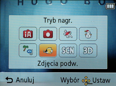 As we already mentioned, in the Panasonic FT3 a selection wheel was replaced by a MODE button – when you press it you can see the recording mode menu displayed and then, using the directional keys you can select the appropriate photographic mode. The choice can be made between a fully automatic iA mode, “Normal photo” mode (the equivalent of the P mode), “Snow”, “Beach and snorkeling”, “Underwater photos”, SCN” (this option hides a selection menu of over 20 thematic modes) and a 3D photo mode.
