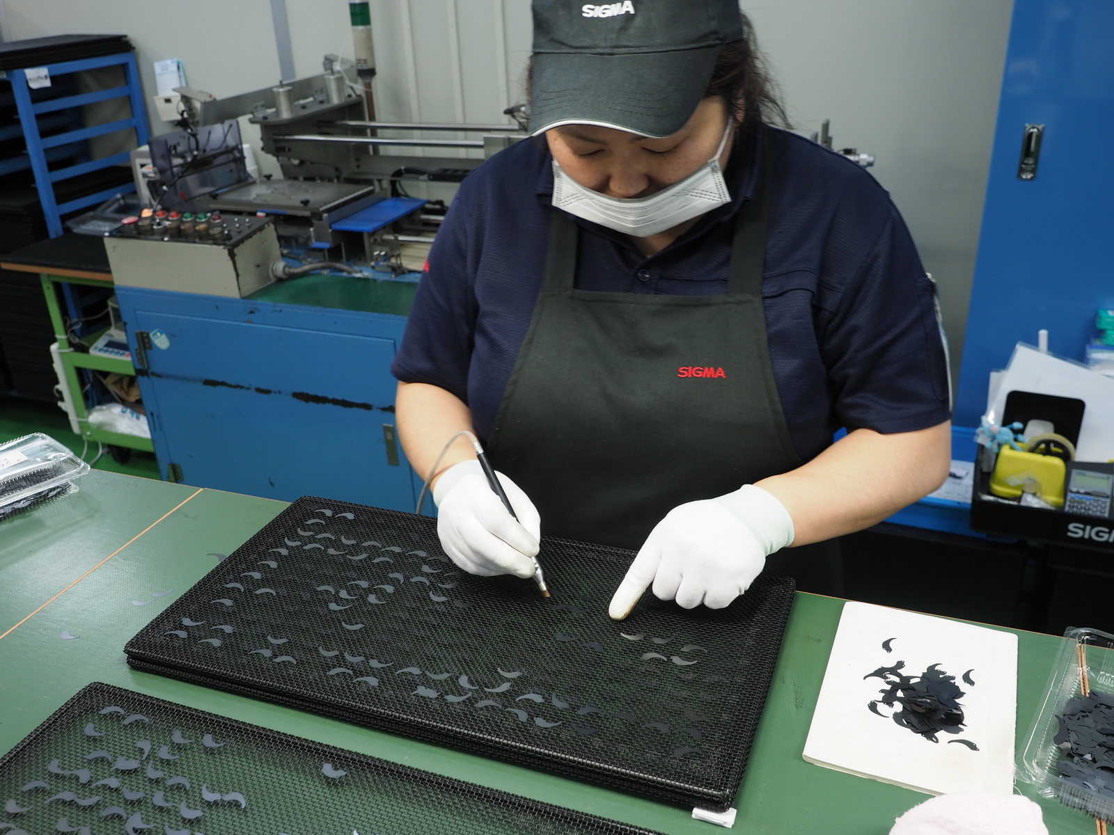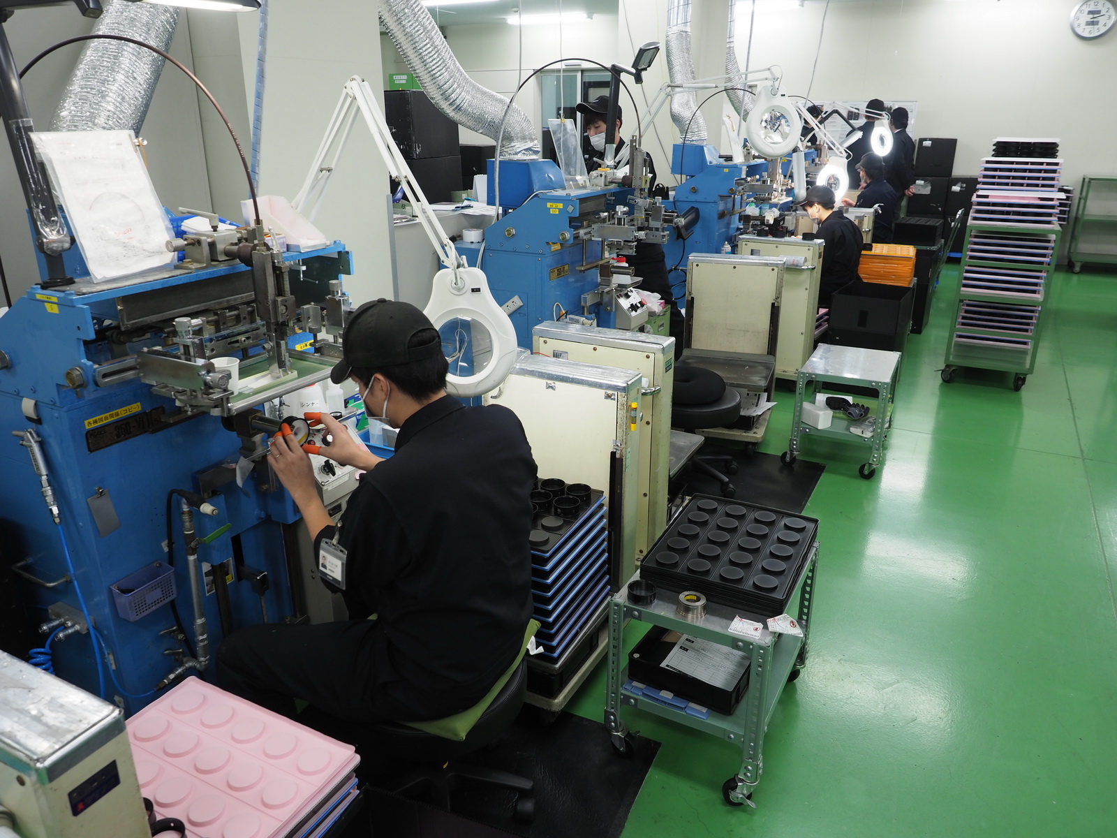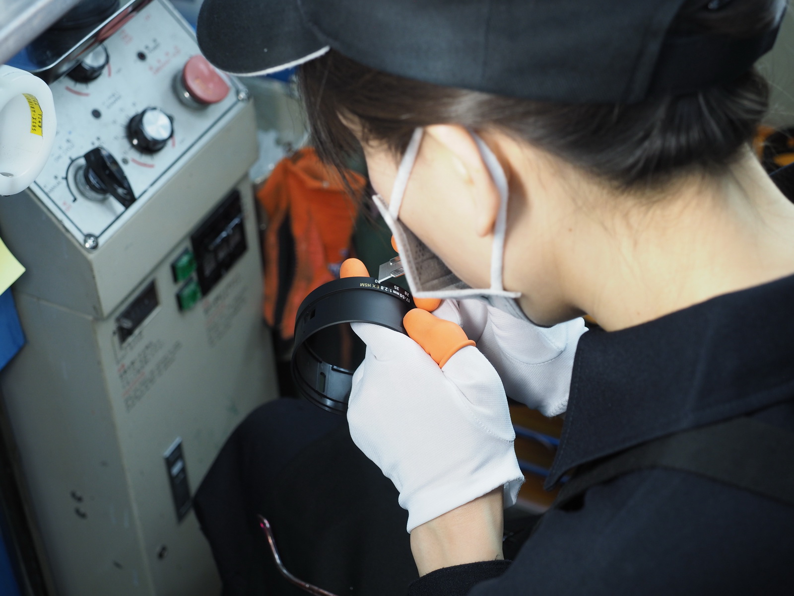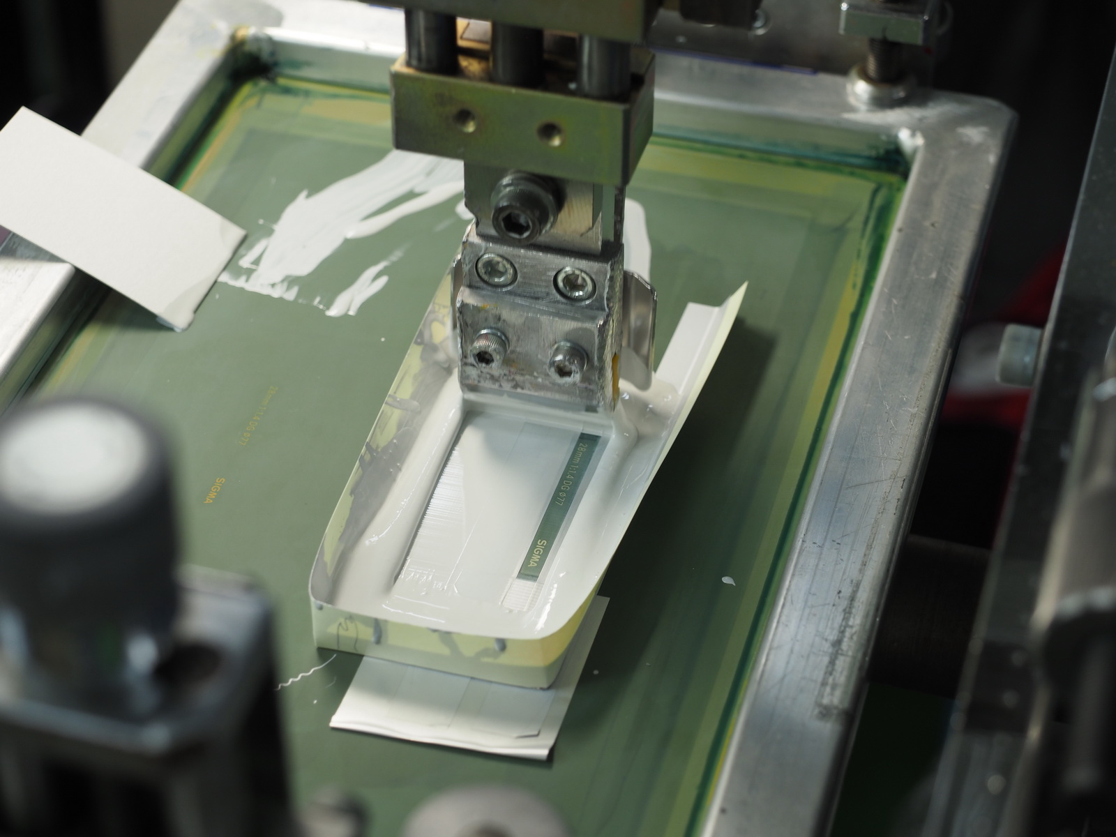 Every part which needs to me marked in any way is manually put into a machine which paints it. So are processed not only tubes but also transparent plastic parts with distance scales or buttons of cameras, like the one shown below with an inscription AEL. After adding appropriate marking the quality of paint is checked – a very painstaking process.