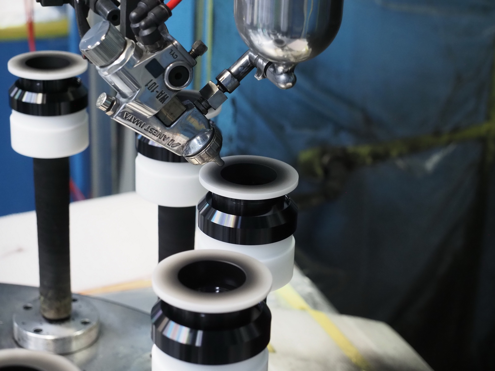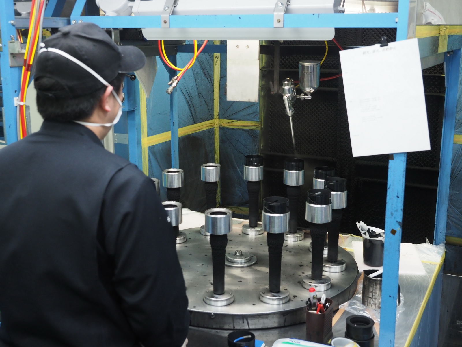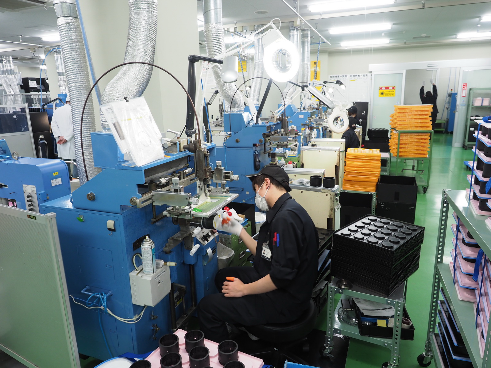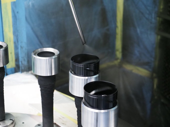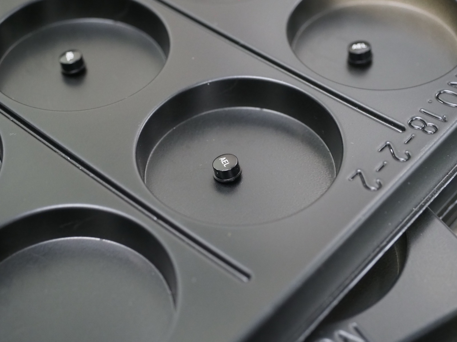 Every part which needs to me marked in any way is manually put into a machine which paints it. So are processed not only tubes but also transparent plastic parts with distance scales or buttons of cameras, like the one shown below with an inscription AEL. After adding appropriate marking the quality of paint is checked – a very painstaking process.