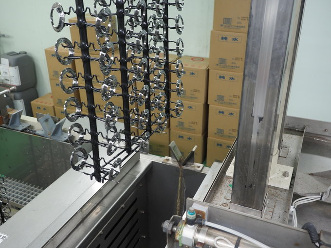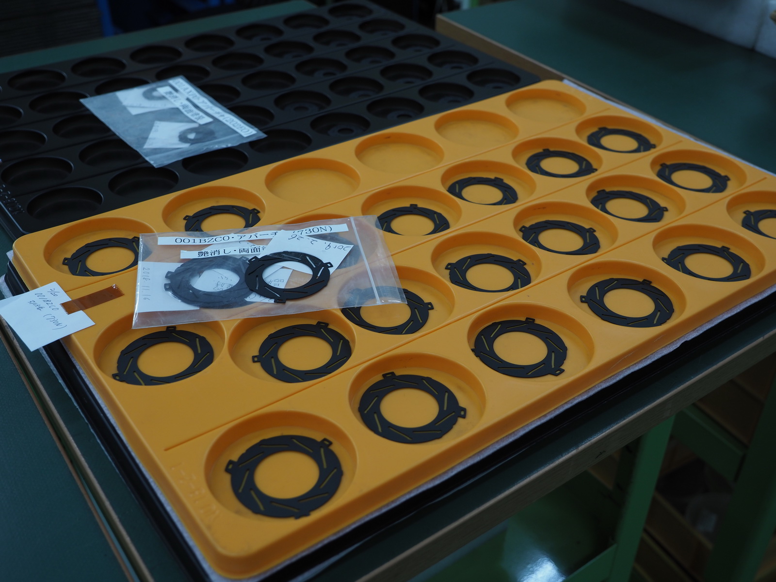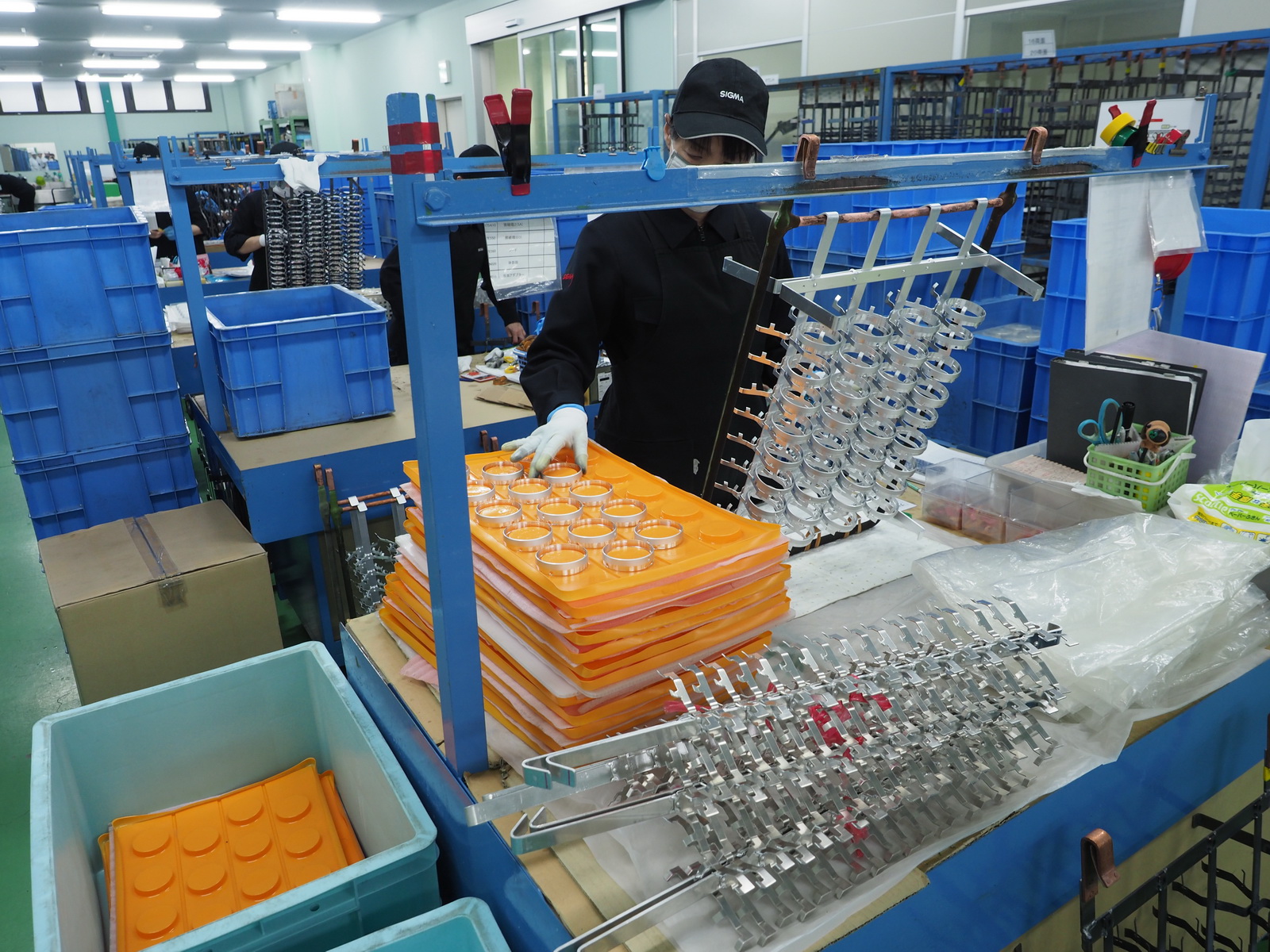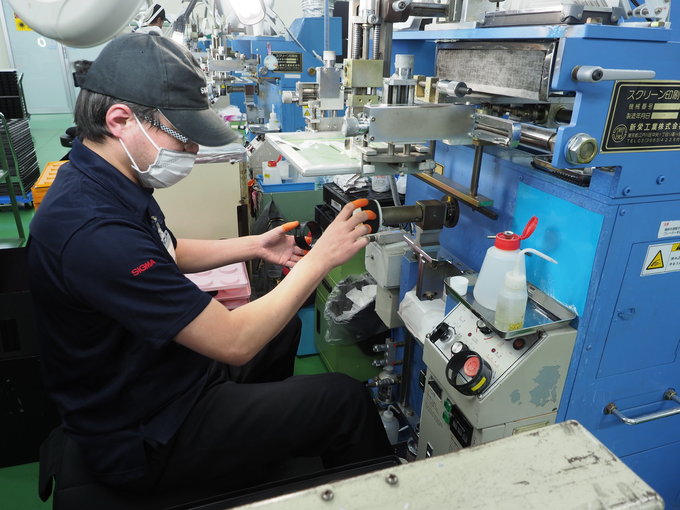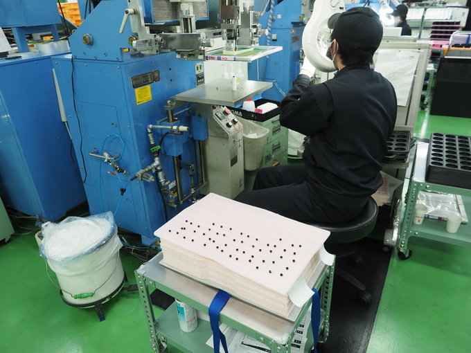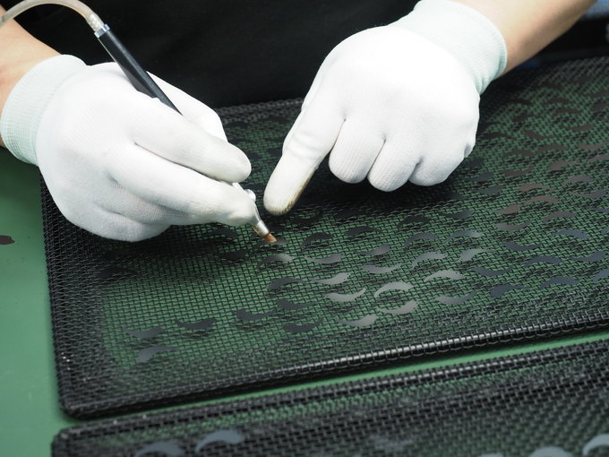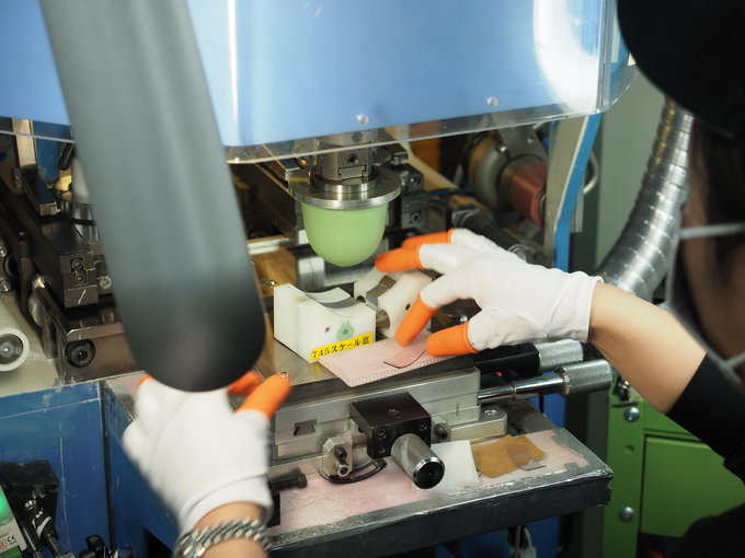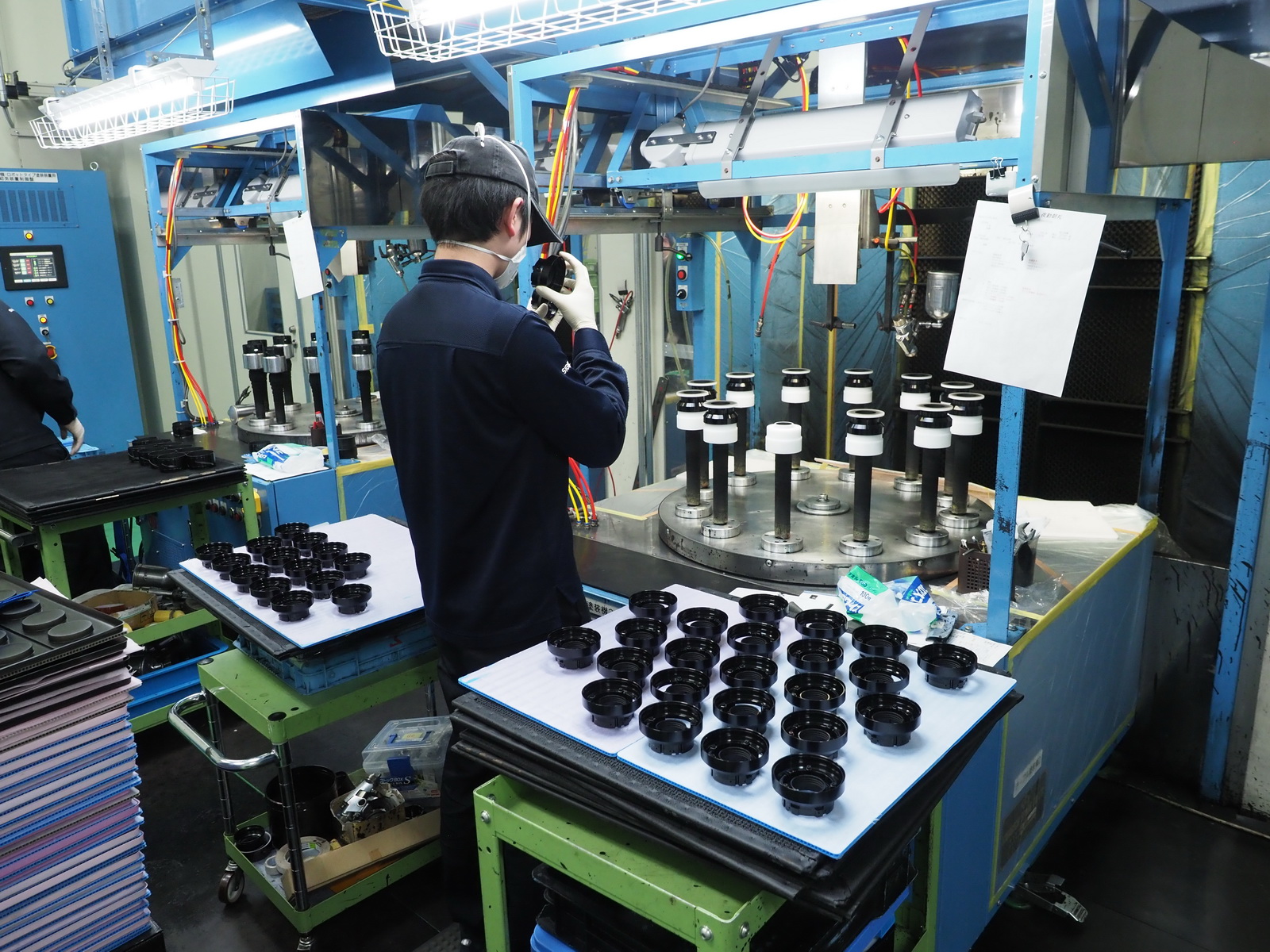 Every part which needs to me marked in any way is manually put into a machine which paints it. So are processed not only tubes but also transparent plastic parts with distance scales or buttons of cameras, like the one shown below with an inscription AEL. After adding appropriate marking the quality of paint is checked – a very painstaking process.