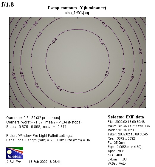 The downfall of the new lens when compared to its full-frame competitors is the rate of falloff decrease. At f/2.8 Nikkor 1.8/35 has corners of the frame darker than the center by 22%, at f/4.0 by 14%. Only using aperture of f/5.6 completely sets us free from the defect (8%).