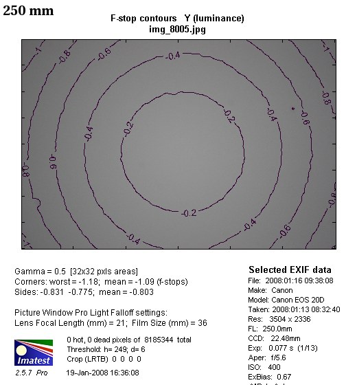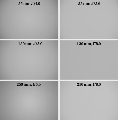 The vignetting starts increasing again at 250mm focal length. At this point, for the maximum aperture, the light fall off in the corners of the frame reaches 31% (-1.09 EV). Fortunately, at f/8.0 it comes down to an acceptable value of 10%.