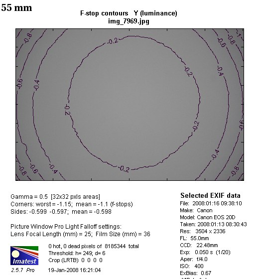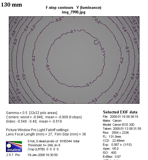 The situation in the middle of the focal length range is a little bit better. Here, for f/5.0 the vignetting reaches 27% (-0.91 EV). Stopping the lens down to f/5.6 makes this value drop down to 21% and at f/8.0 it disappears (3%).