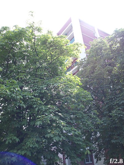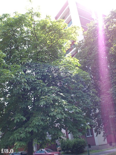 As for working against bright light, we’ll find some more reasons to complain. The front lens, although it’s small, is not screened from the side by anything, which may cause the effects we present in the pictures below. At the maximum aperture we were able to easily catch a characteristic blue glow in the corner opposite the one with the bright source of light. Once we strongly stopped down the lens, we were dealing with a violet streak that changed its shape and intensity depending on the position of the Sun in the frame.