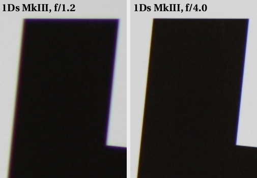 Here also we can attempt a short digression about sharpened and/or JPEG files tests. The aberration level is measured by calculating the surface between the curves of the tangential edge between black and white for the red and blue curve. The size of that surface can be objectively measured solely and only on a non-sharpened RAW file. Every additional action, like sharpening or JPEG compression, changes that surface in a way difficult to predict and turns it into something quite different from the original.