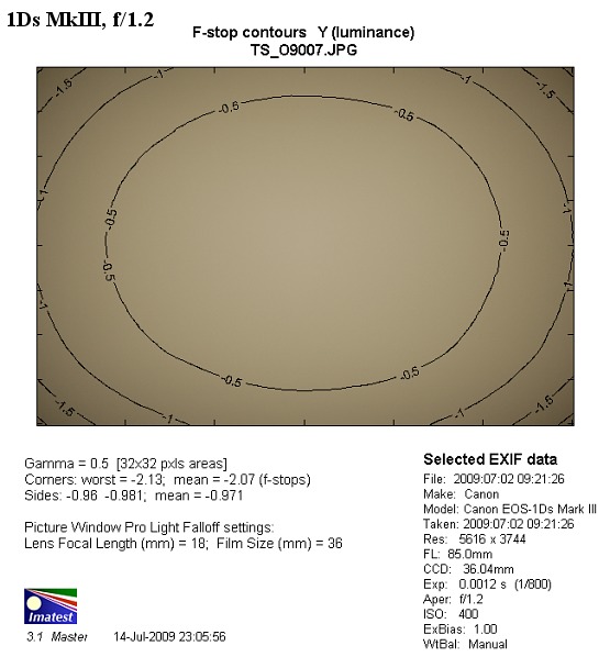 How to comment on such a result? The 50% vignetting level is making a big impression on our readers, used to APS-C matrixes results level. There, we’ve complained a lot if the aberration reached 30-40%. Full frame is something totally different, though. The sensor is huge so, when it comes to fast lenses, the 2-3 EV vignetting should be, in fact, considered a norm. For the fast portrait lens as the 85L, its influence will be seen but it is not necessarily always a problem for the photographer. Many people add some vignetting on purpose, to infuse their pictures with some mythical art – here we have this effect for free…The situation is worse when we don’t want the vignetting. We can get rid of it using a computer application but, firstly, brightening by 2EV causes proportionately more noise and, secondly, we can’t retrieve the lost image quality by brightening.