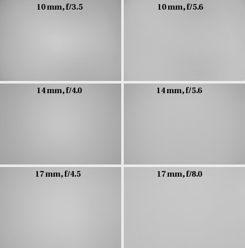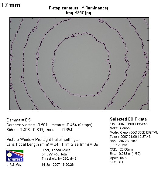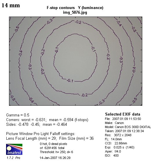 The results for greater focal lengths are much more precise. For 14 mm and a diaphragm of f/4.0 the light falloff in the corners reaches 19% (-0.61 EV), after using the aperture of f/5.6 it drops to 12%. The problem fades away for aperture of f/8 and reaching 7%.