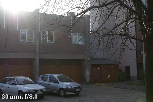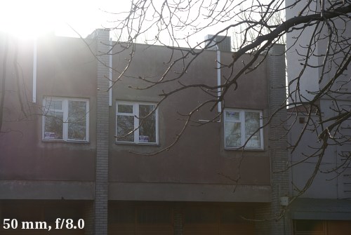 When it comes to working agains bright light it’s not that bad. At the widest angle the flares are perceptible but they lack intensity and their number is not huge. At 30 mm the situation improves a lot and at 50-80 mm range the problem mainly consists of a slightly worse contrast.