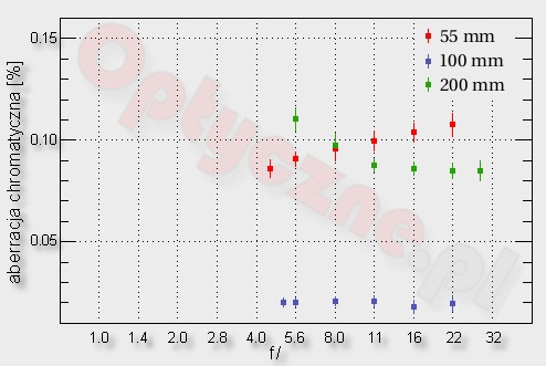 The chromatic aberration completely disappears at the 100 mm focal length, which is a very interesting characteristic for the Canon 55-200. When using a diaphragm, the aberration is at a 0.02% level. It is thanks to this feature that the picture resolution at the edges of the frame at 100 mm is so good.