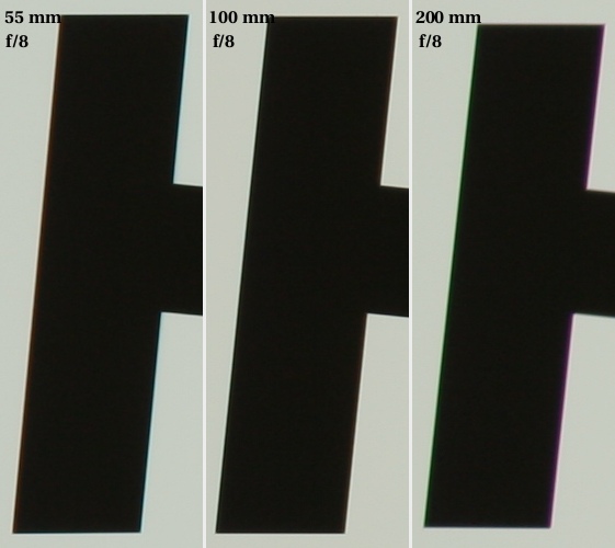 In the pictures below we present the ISO table 1:1 clippings set up 70% away from the center of the field of view. We can clearly see the high chromatic aberration at 55 and 200 mm and its absence at 100 mm.