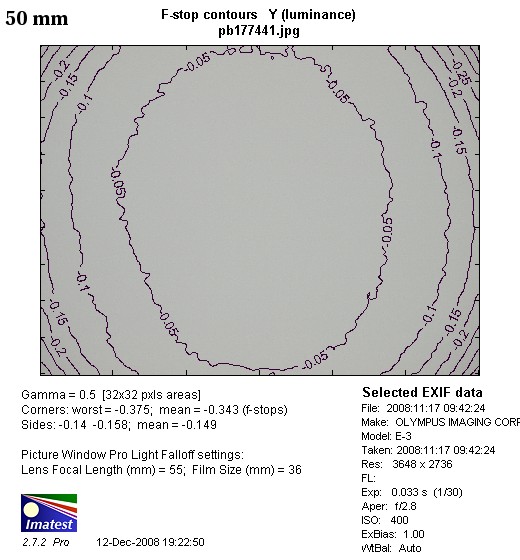 At 50 mm and wide relative aperture the vignetting is just 11% ( -0.34 EV) so practically imperceptible. On stopping down to f/4.0 we get just 4%.