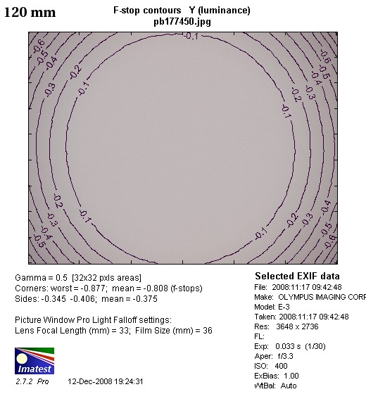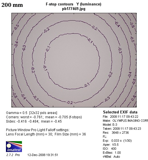 The situation is slightly beter at 200 mm setting. At wide aperture f/3.5 the vignetting reaches 22% ( -0.71 EV) and decreases to 16% by f/4.0. Using the f/5.6 aperture makes the problem disappear completely (8%).