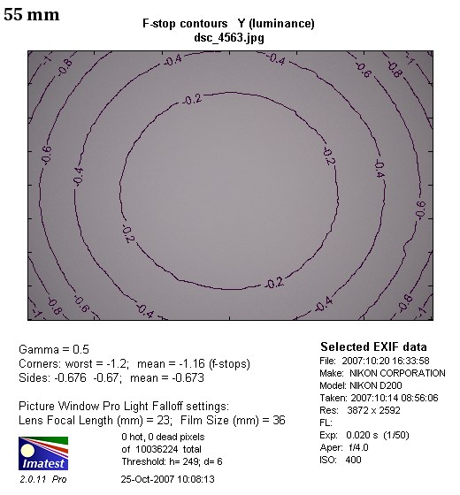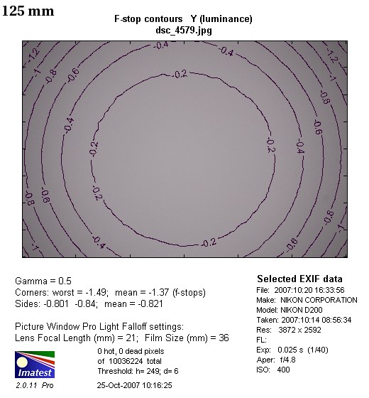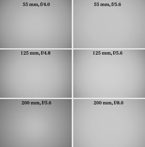 At 200 mm the results are not good either. At the maximum relative aperture the vignetting amounts to 37% (-1.35 EV) and by stopping down to f/8.0 it decreases to 20%. Only usage of f/11 makes the problem disappear completely (3%).