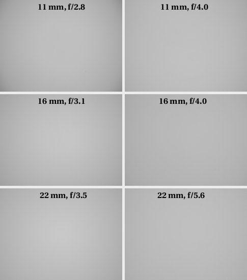 The results are even better for longer focal lengths. At 16 mm and by f/3.1 the brightness loss amounted to 17% (-0.55 EV). On stopping down the lens to f/4.0 we don’t have to bother ourselves with the vignetting at all (10%).