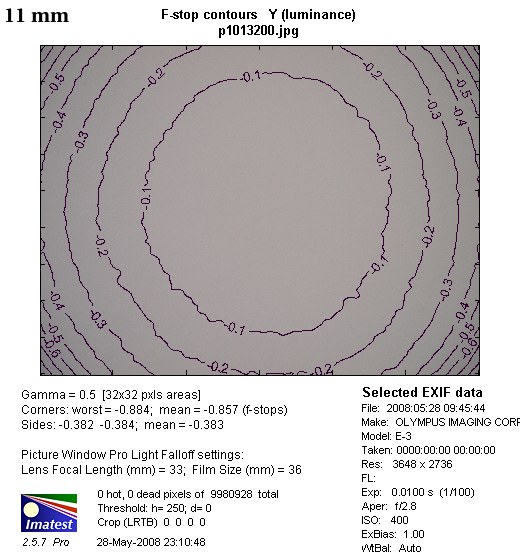 For the combination of the shortest focal length and maximum relative aperture the light fall-off, measured by us in the frame corners, amounted to 26% (-0.89 EV). This value is not perhaps very low but in the 90 degrees field of view lenses class it is still one of better results. The advantage of the 4/3rds system is clear here, especially that, on stopping down the lens to f/4.0 the aberration disappears almost completely, reaching just 12%.