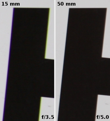 We can see that aberration will trouble us the most at the difficult combination of the widest angle and maximum aperture. There it’s large. Fortunately, stopping down by 1 EV brings it down to a medium level.