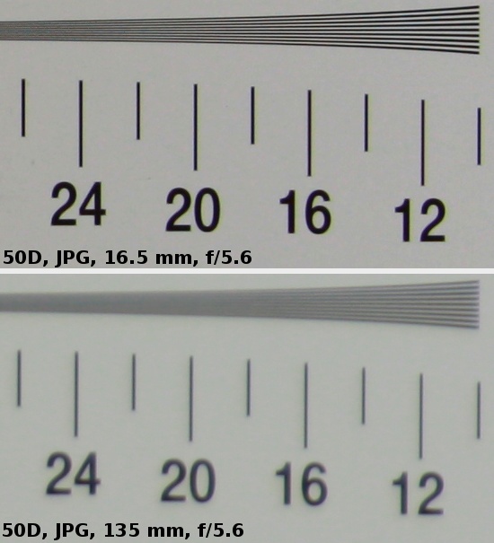 I must say it is one of the most uncharacteristic graphs I’ve dealt with so far. It’s the effect of three factors. Firstly the lens is exceptionally weak at the maximum relative aperture. Up to now we considered 30 lpmm as a decency level but it was used only in the tests conducted on 20D or 1Ds MkIII cameras. In the case of an EOS 50D the pixel density is greater and MTF values – higher. Reminding ourselves the results the Canon EF 100 mm f/2.8L Macro IS USM reached on the 20D and the 50D cameras we can easily notice that the MTFs obtained on the 50D are about 10% higher than these got on the 20D. We can assume that the decency level on the 50D begins near 33-35 lpmm. At the maximum relative aperture the Tokina 16.5-135 mm never reaches such values and at longer focal lengths its results are simply terrible.