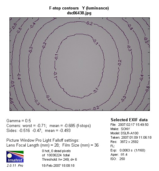An interesting thing is the oval shape of the contours reflecting the vignetting. It is perfectly seen on the below photograph. It is not the effect of a bad lighting of the chart, since it is present at all our photos, between which the body was turned of the 90 degrees angle.