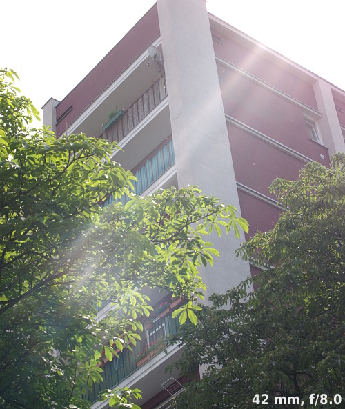 In the case of the tested lens the work against bright light is not bad. Unfortunately it is also not so perfect either. You can notice it especially at longer focal lengths where you can catch different light artifacts and often you see an overall contrast decrease.