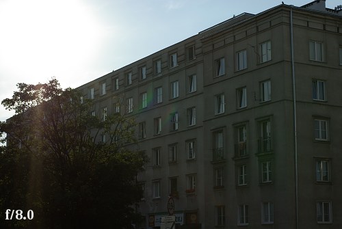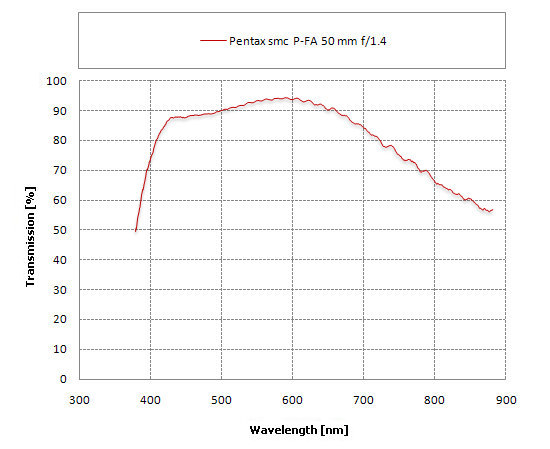 The maximum of its possibilities in this category the lenses reaches near 600 nm wavelength, where the transmission amounts to 93-94%. Taking into account the fact that we deal here with 6 groups of elements so 12 air-to-glass surfaces, on one such surface we lose 0.6% of light. It is not much but still two times more than the level of 0.3%, touted by Pentax. Apparently the best coatings are reserved just for “star” and elite “limited” products. Fortunately for the 50 mm, tested here, the transmission efficiency is also high at other wavelengths and, for instance in the centre of the visible spectrum it reaches significantly over 90% and for blue light – on the level of 88%.