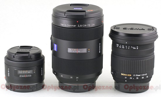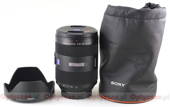 It’s enough to click the following link to compare the tested lens with its competitors. You can notice at once that each producer decided to apply a bit different approach here. Canon in its EF 24-70 mm f/2.8L USM used such a construction that the lens is the smallest at 70 mm. The Zeiss is made the other way round, being the most folded at 24 mm. The Nikkor, for a change, reaches minimum dimensions near 50 mm focal length and then it extends, no matter whether you increase or shorten the focal length value. The Zeiss is the heaviest lens of all four devices, presented here, but the differences are minimal; it is also distinctly the smallest, being from 4 to 22 mm shorter than its competitors.