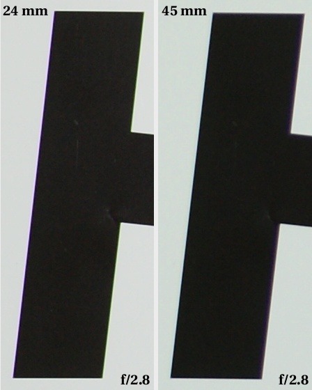 The aberration increases a bit at 24 mm, where it amounts to 0.06%, but still such a level is rather low.