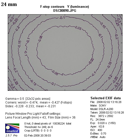 At 24 mm focal length and wide open the brightness loss in the frame corners is 14% (-0.43 EV). On stopping down to f/4.0 we see the problem being eliminated completely, reducing it to the level of 10%.