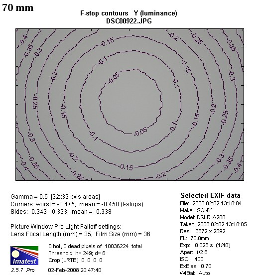 At 70 mm the level of this aberration increases slightly once again and, at the maximum relative aperture, it amounts to the aforementioned value of 15% (-0.46 EV); by f/4.0 it decreases to 5%.