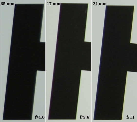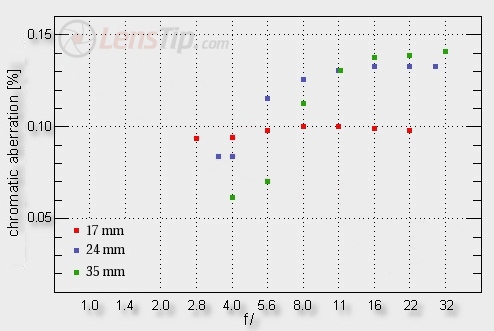 At 17 mm the situation is not that bad because the aberration keeps there a more or less constant level of 0.1% which we consider medium. In the range of 24-35 mm we see something rather different, though. While near the maximum relative aperture the aberration is still medium or even low, it increases very steeply on stopping down. It doesn’t allow the lens to show its real possibilities. On stopping down the other off-axis aberration, like the coma or the astigmatism decrease swiftly, so the image at the edge should have improved. We don’t see the improvement here because the fast increase of chromatism interferes with it.