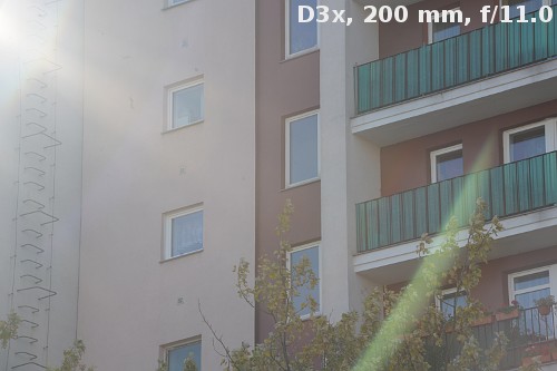 A huge front element, a complex optical construction, a lot of movable parts and a wide angle of view – all of these factors make the work against bright light more problematic. In fact the problems occur during shooting on the D200 and on the D3x as well. The photos below show them very clearly.