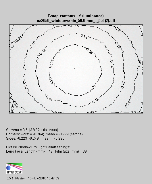 As you can notice the vignetting won’t be a problem here. It is practically independent of the aperture value, ranging from –0.3 EV (9.5%) at 20 mm focal length to −0.229 EV (7.6%) at 50 mm focal length.