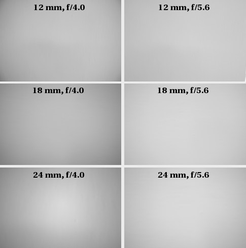 At 12 mm and maximum relative aperture nothing announces serious problems yet because the brightness loss in the frame corners amounts to 32% (-1.13 EV) – high but typical for this kind of devices. Stopping down helps but not to a satisfactory level: by f/5.6 the vignetting reaches 23%, by f/8.0 it is still 15% and only by f/11 it nears the level of 10%, which we consider imperceptible.