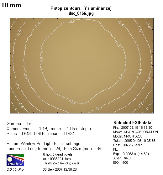 Longer focal lengths are the area where the Tokina dominates over the Nikkor. The latter at 18 mm and by f/4.0 shows 31% (-1.08 EV) of light fall-off in the frame corners. Fortunately for this focal length the stopping down helps a lot because by f/5.6 we descend to the level of 15% and by f/8.0 we get only 9%.