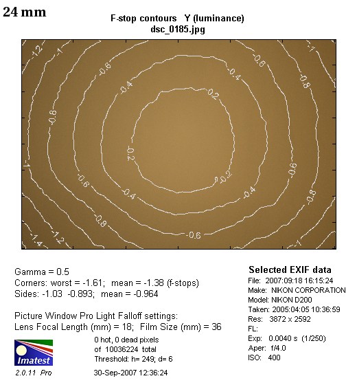 The worst situation is at 24 mm where, by f/4.0, we get the vignetting of 38% (-1.38 EV) which, by f/5.6, decreases to 20% and only by f/8.0 it reaches an imperceptible level of 10%.
