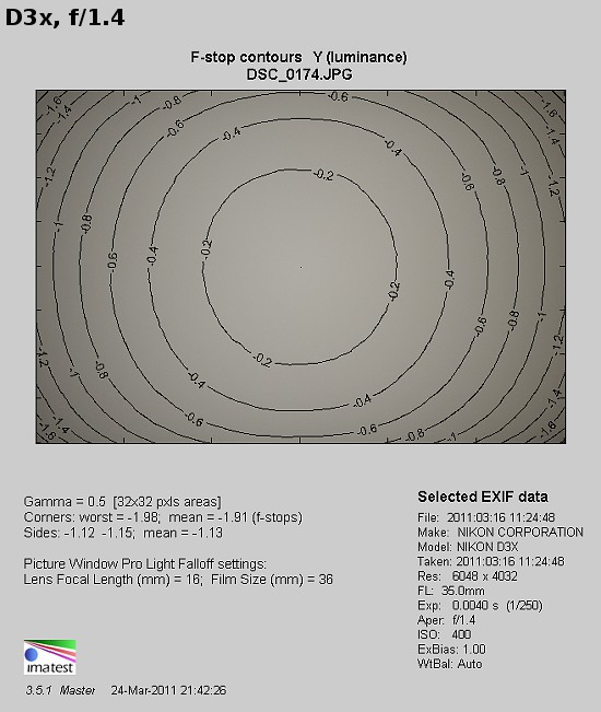 As you see the vignetting is not bothersome and even on the maximum relative aperture it doesn’t disturb us a lot because it amounts to only 21% (-0.68 EV). The problems disappears completely by f/2.0, where the vignetting is 9% (-0.26 EV).