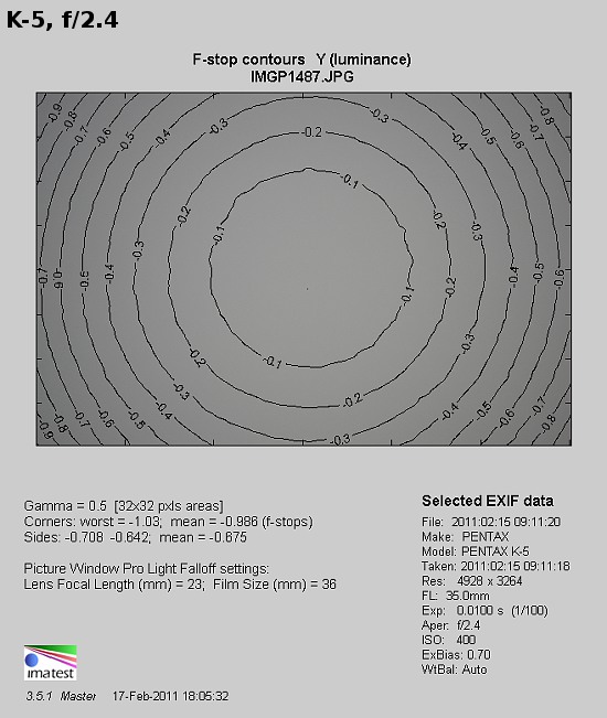 The Nikkor 1.8/35 at the maximum relative aperture showed vignetting on the level of 37%. By f/2.8 its result was a bit better than that of the Pentax (22%) and, what’s interesting, by f/4.0 it was a tad worse for a change (14%).
