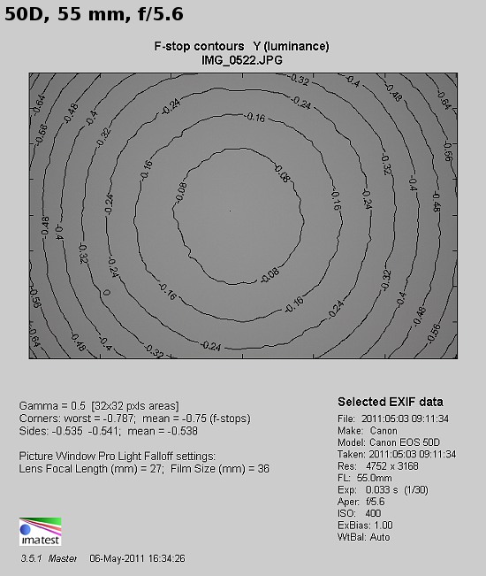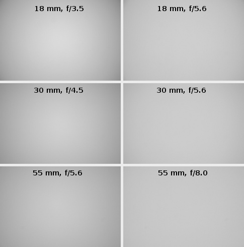 At 30 mm and wide open the vignetting reaches 27% (-0.90 EV) and it decreases to 13% (-0.40 EV) by f/5.6 and to 9% (-0.28 EV) by f/8.0.