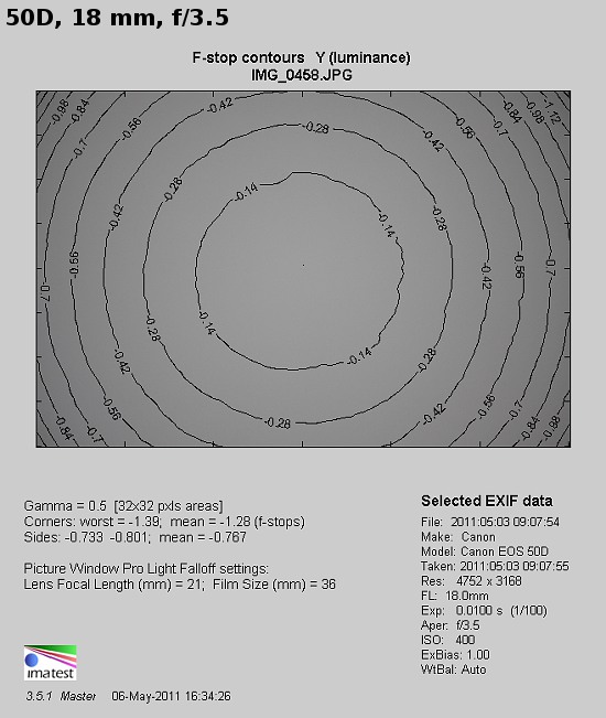 In the case of 18 mm focal length and by f/3.5 the vignetting is 36% (-1.28 EV). By f/4.0 that value descends to 30% (-1.03 EV) and by f/5.6 it amounts to 18% (-0.56 EV). The brightness loss in the frame corners becomes negligible only by f/8.0, where it is 13%. On further stopping down you can’t notice any significant, measurable drop of this aberration’s level.