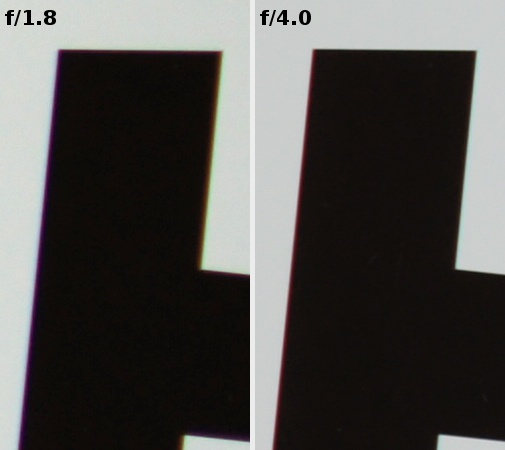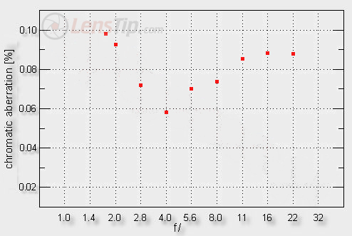 First of all we see here a performance definitely more promising than that of the Nikkor 1.8/35 which showed a significant aberration on the level of 0.13-0.17%. The Sony doesn’t exceed the value of 0.1% even at the maximum relative aperture and momentarily its aberration decreases to an imperceptible level of 0.06%. The lateral chromatic aberration is something a typical user of this lens doesn’t have to worry about.