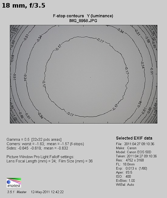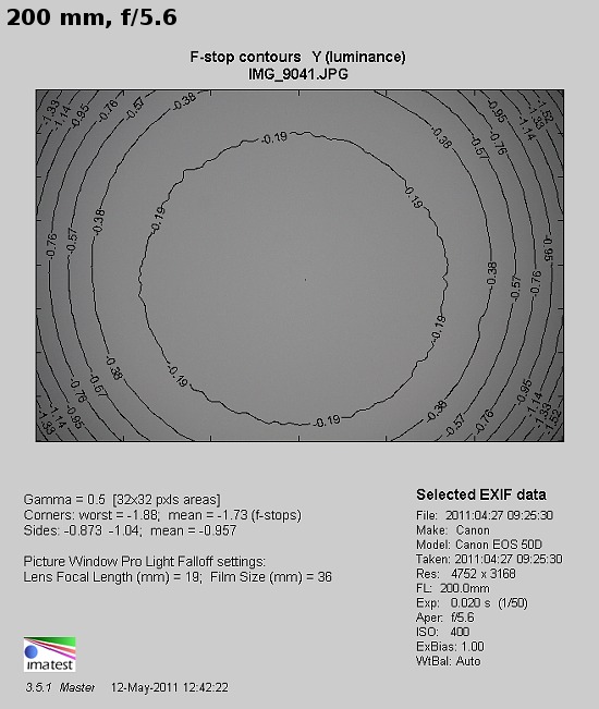 The most serious problems can be noticed by f/5.6 and at the maximum focal length where the vignetting is 45% (-1.73 EV) and it decreases to 22% (-0.71 EV) by f/8.0. By f/11 and f/16 it becomes negligible, amounting to 13% and 8% respectively.