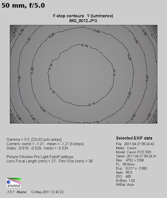On further increase of focal lengths we can observe a gradual rise of the vignetting too. At 50 mm and by f/5.0 this aberration reaches 34% (-1.21 EV). On stopping down to f/5.6 the light fall-off in the corners amounts to 22% (-0.71 EV) and it becomes not very bothersome by f/8.0 (11%). In the case of 100 mm focal length the maximum relative aperture gives you the vignetting level of 42% (-1.59 EV) and by using f/8.0 you can reduce this aberration to 19% (-0.62 EV). Only by f/11 it becomes imperceptible, amounting to just 11%.