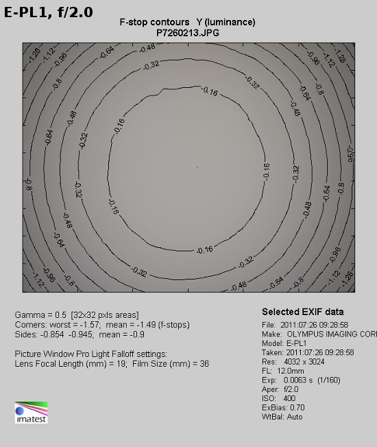 Because of the program distortion correction RAW files have a bit wider angle of view that JPEG files. That’s why the vignetting measured using the former format is a bit higher as well. However, in this case the differences are not big - the level of RAW vignetting is just 2-4% higher than that of JPEG files.