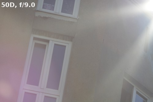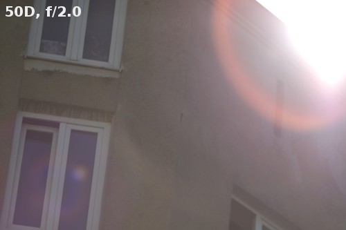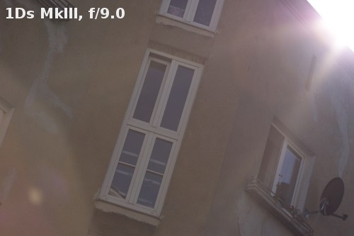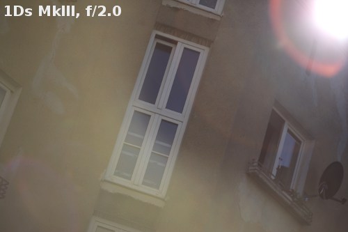 Such old optical constructions as the tested Canon 135L often have problems with work against bright light. To tell you the truth I didn’t expect fantastic results here and I wasn’t surprised they are indeed far from fantastic. Light artifacts appear during the work on both types of sensor and no matter what aperture value is used. Fortunately they are visible only when the source of bright light is situated very close to the frame corner or directly inside the frame; such situations rarely happen when you work with a 135 mm lens. Apart from that you can always use a hood which is a part of the accessory kit.