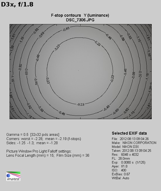 The chart below shows a comparison between the performance of the Nikkor and that of its rivals. As you see all lenses present very similar results. What’s interesting it’s the Sigma 1.8/28, with the biggest front element (its filter is 77 mm in diameter) fares the worst here.